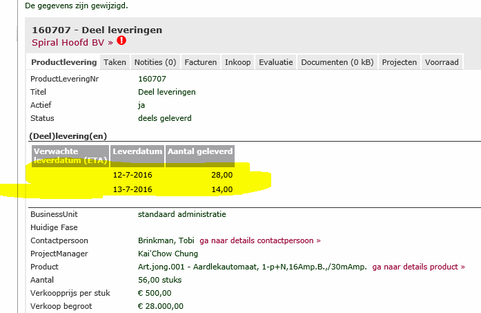 Wanneer je bij de productlevering een of meerdere deellevering(en) hebt ingevuld, dan kun je via de details van de productlevering een pakbon uitdraaien voor de productlevering.