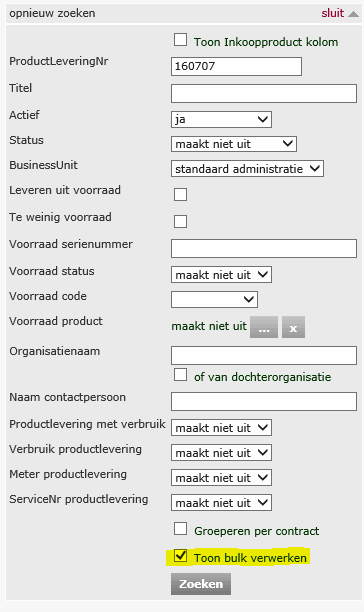 Indien het gewenst is om meerdere productleveringen op de pakbon te plaatsen dan is via het scherm Productleveringen de pakbon te genereren. Via opnieuw zoeken vink je 'Toon bulk verwerken' aan.