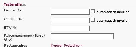 Voor facturatie is het nodig om een BTW nummer van de relatie of particulier vast te leggen. Dit is mogelijk onder sectie ‘facturatie’ (onder crediteur nummer veld) van de relatie of particuliere contactpersoon.
