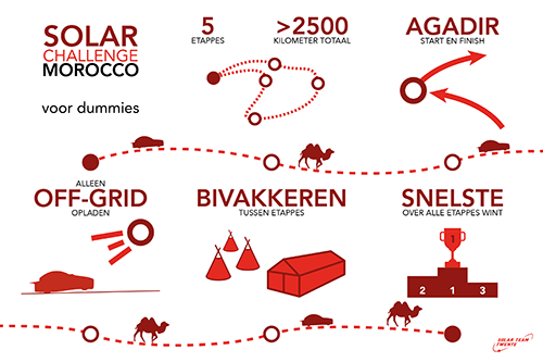 Dat alternatief is nu dus gevonden. Samen met rallyorganisatie Classic Events uit Vaassen initieerde het team uit Twente een nieuwe uitdaging in Marokko. De ruim 2.500 kilometer lange rallyrace onder de Marokkaanse zon gaat het uiterste vragen van de zonneauto’s en van de teams. De Solar Challenge Morocco wordt een legendarische rally van vijf etappes. De race start en eindigt in havenstad Agadir en voert vooral door het zuidelijk deel van Marokko, aan de voet van het Atlasgebergte en de rand van de Sahara. Het team dat de totale afstand het snelst aflegt, wint. De opzet verschilt daarmee van de inmiddels bekende race in Australië.